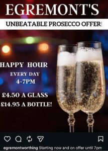 Join us every day for Happy Hour from 4pm–7pm and enjoy one of the best Prosecco deals in Worthing at The Egremont.
